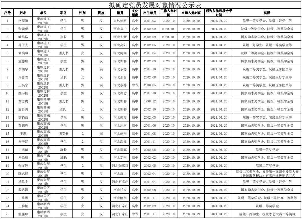 经党支部研究,在党员推荐、团组织推优的基础上,拟确定以下 25 名同志为党员发展对象,现将这些同志的基本情况予以公示,敬请广大党员、群众评议、监督。如有意见和建议请于 5 月13日前向党支部或上级党组织反映。